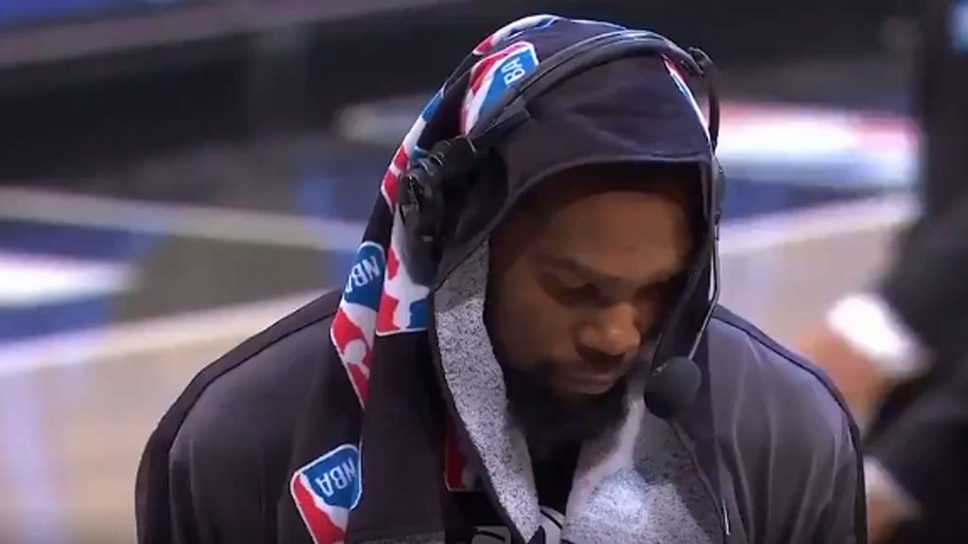 Kevin durant of the brooklyn nets sits during a game against the toronto raptors at barclays center on feb.